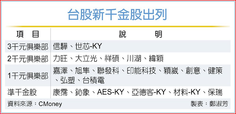 千金股新兵到位,全新的千金股成員含信驊、世芯-KY、力旺、大立光、祥碩、川湖、緯創、嘉澤、旭隼、聯發科、印能科技、穎崴、創意、健策、弘塑、台積電等16檔,3,000元俱樂部26日雖有力旺企圖叩關,但盤中只攻上2,995元就告止步,倒是川湖和緯穎順利挑戰2,000元俱樂部成功。