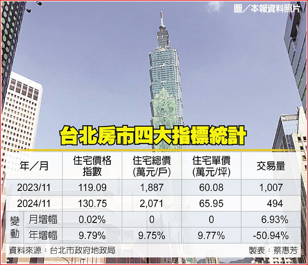 北市地政局26日發布不動產價格資訊「2025年2月動態月報」,彙整自實價登錄資訊的北市住宅價格指數,去年11月達130.75,為史上最高紀錄,較10月的130.72上升0.02、年漲9.79%。