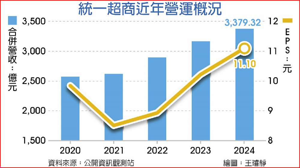 統一超商受惠本業台灣7-ELEVEN及轉投資事業菲律賓7-ELEVEN、統一生活(康是美)、上海7-ELEVEN、統一速達(黑貓宅急便)、悠旅生活(台灣星巴克)等整體獲利持續往上,2024全年合併營收達破紀錄的3,379.32億元、年增6.59%,合併稅後純益達115.39億元、年增8.72%,每股稅後純益達11.10元,創史上次高,26日董事會通過擬配發現金股息9元。