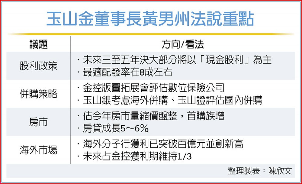 隨國內金金併持續,黃男州認為,進入金控2.0時代,玉山金將持續金控版圖的擴大,未來主體銀行以自我成長優先,也會考慮策略聯盟或海外併購,隨金管會開放數位保險公司且可用實體與數位同步經營,加上明年起保險業新會計制度上路,對保險業來說是挑戰,對市場來說同時也充滿機會,玉山金會審慎評估併購的機會;玉山證雖市占率僅有1.8%,有機會也可透過併購來擴大發展。