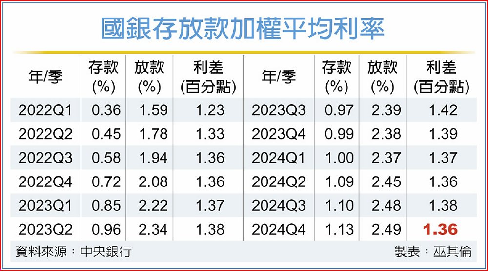 中央銀行公布去年第四季國銀存放款加權平均利率,存放款利率同步上揚,雙創2009年1月以來的16年新高水準,存放款利差較前季略降0.02個百分點至1.36個百分點,因今年恐無降息空間,甚至有可能升息,放款利率維持在高水位,可挹注銀行利息收入,但市場競爭激烈,銀行開始調結構,授信轉向外幣為主。