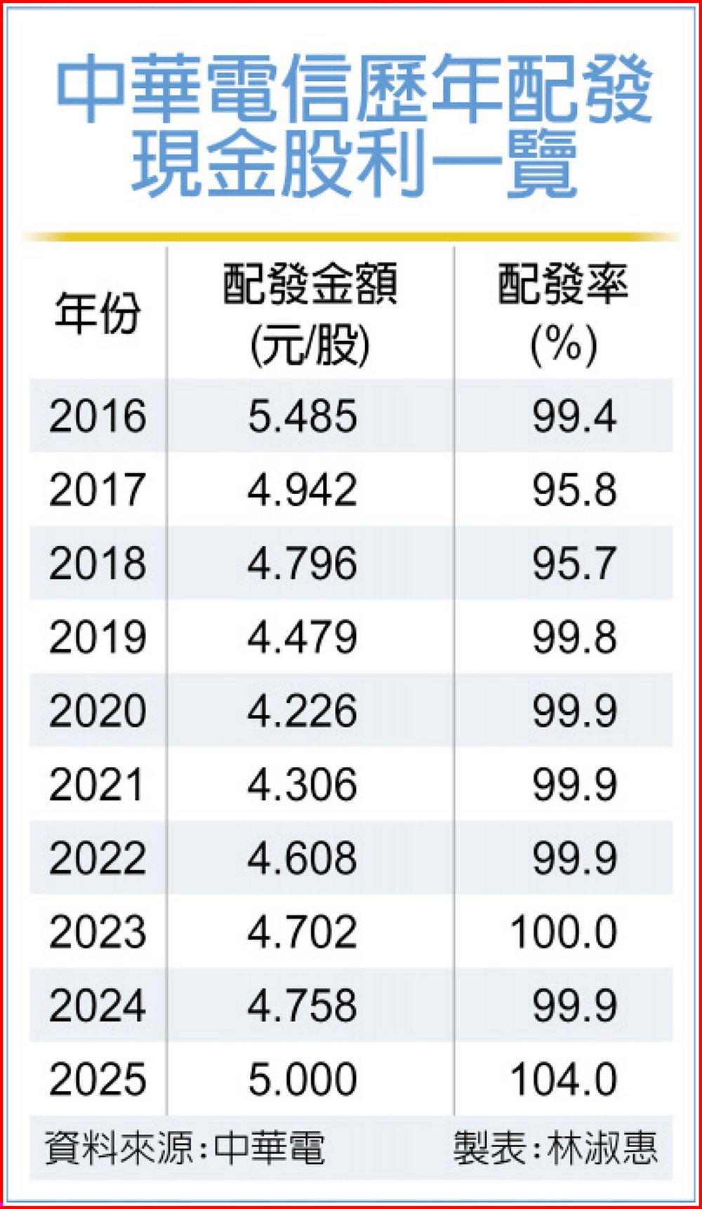中華電26日董事會通過配發現金股利每股5元,配發率104%創歷史新高,以26日收盤價127.5元計算,股息殖利率3.92%,今年總計將配發387.87億元現金股利。