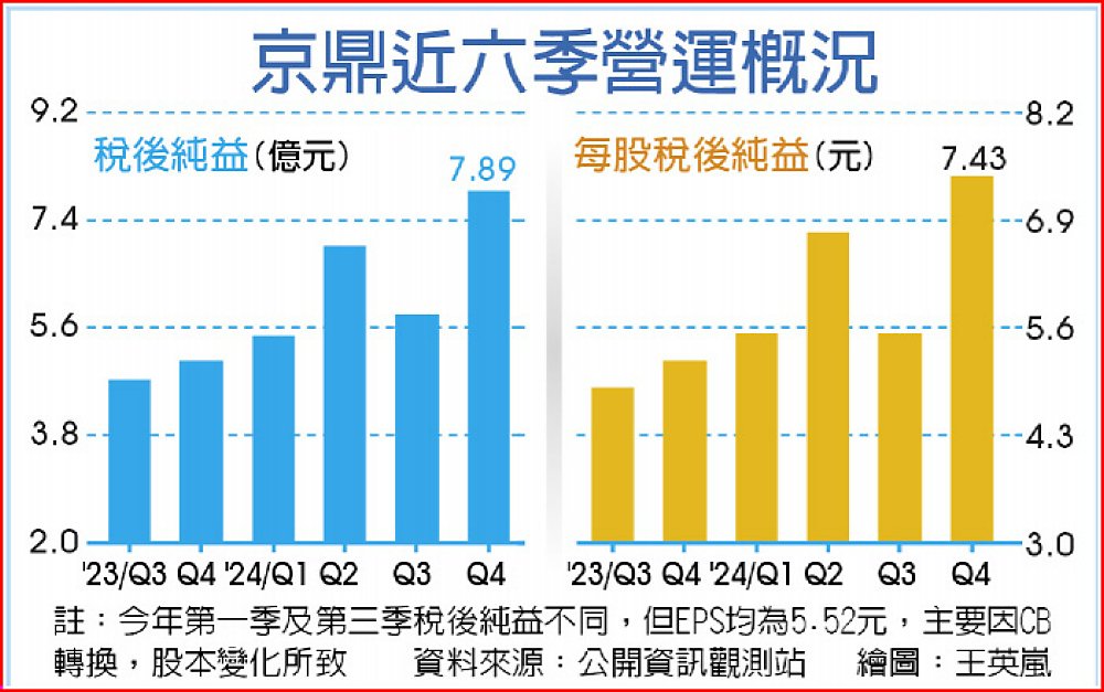 京鼎去年全年每股獲利表現亮眼,全年營收164.54億元,稅後純益26.13億元、年成長31.31%,獲利成長力道強勁,全年每股稅後純益達25.22元,去年營收、獲利及每股獲利全面創下歷史新高。
