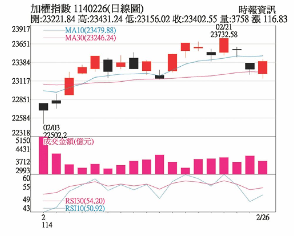 在川普關稅政策上,首波對輸往美鋼、鋁將課徵25%關稅,4月初會對半導體、汽車、藥品開徵25%關稅,而且逐步提高,在上述美國總體經濟前景堪憂,加上川普課稅箭在弦上,導致本周眾多美科技股於2月下旬陷入修正,台股也難以擺脫空方追擊的打壓,科技電子股成壓盤重心,所幸26日台股回測季線有撐,意味當前季線買盤相對積極,當前指數以季線反彈至5日線之間震盪。