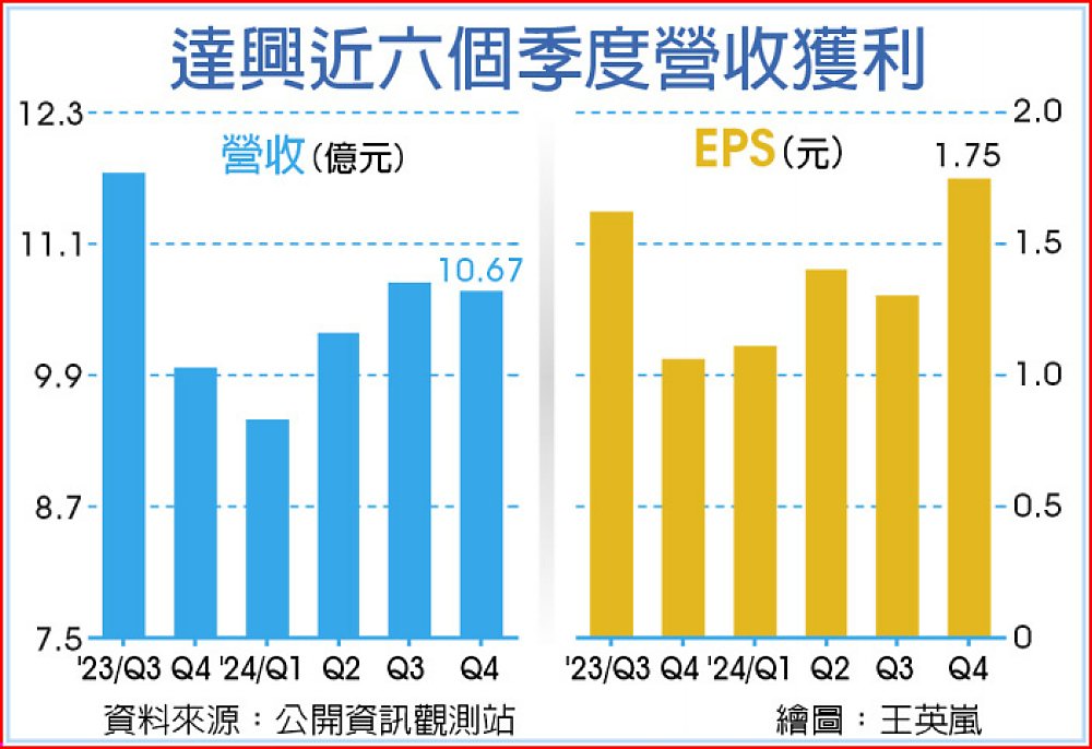 特用材料廠達興(5234)舉行法說會,董事長林正一表示,去年第四季半導體材料營收占比超過1成,今年還有3~5個產品加入,將迎來快速成長,預估半導體材料業績會有高二位數甚至三位數成長。顯示器材料會保持較穩定的產能利用率,營收也會恢復成長。整體來說,2025年是一個可以期待優質成長的一年。