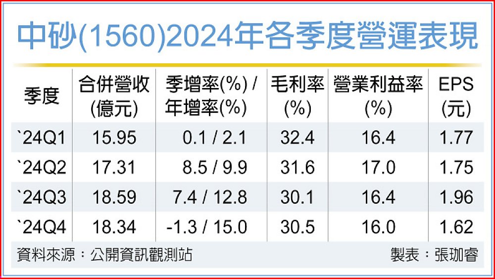 展望2025年第一季,中砂坦言,客戶受南科地震影響,整體生產線運行驟停,同步受到影響,本季度業績走疲;不過相關生產線已陸續回到正軌,拉貨力道回升下,第二季營運將恢復。