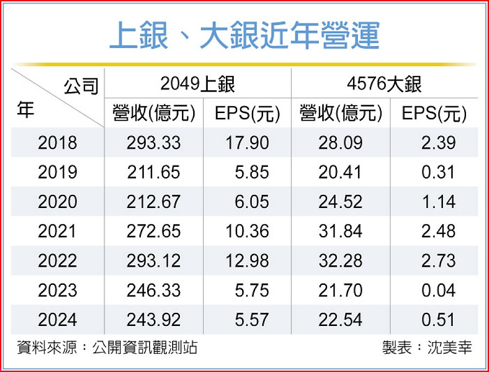 半導體產業景氣好轉,上銀集團旗下上銀(2049)、大銀微系統(4576)因應短急單,首季產線忙加班,今年營收及獲利拚成長,26日董事會承認去年財報,上銀去年營收略減,每股稅後純益(EPS)降至5.57元,擬配發現金股息2.4元;大銀營收增長,去年EPS大增至0.51元,擬配息0.2元。