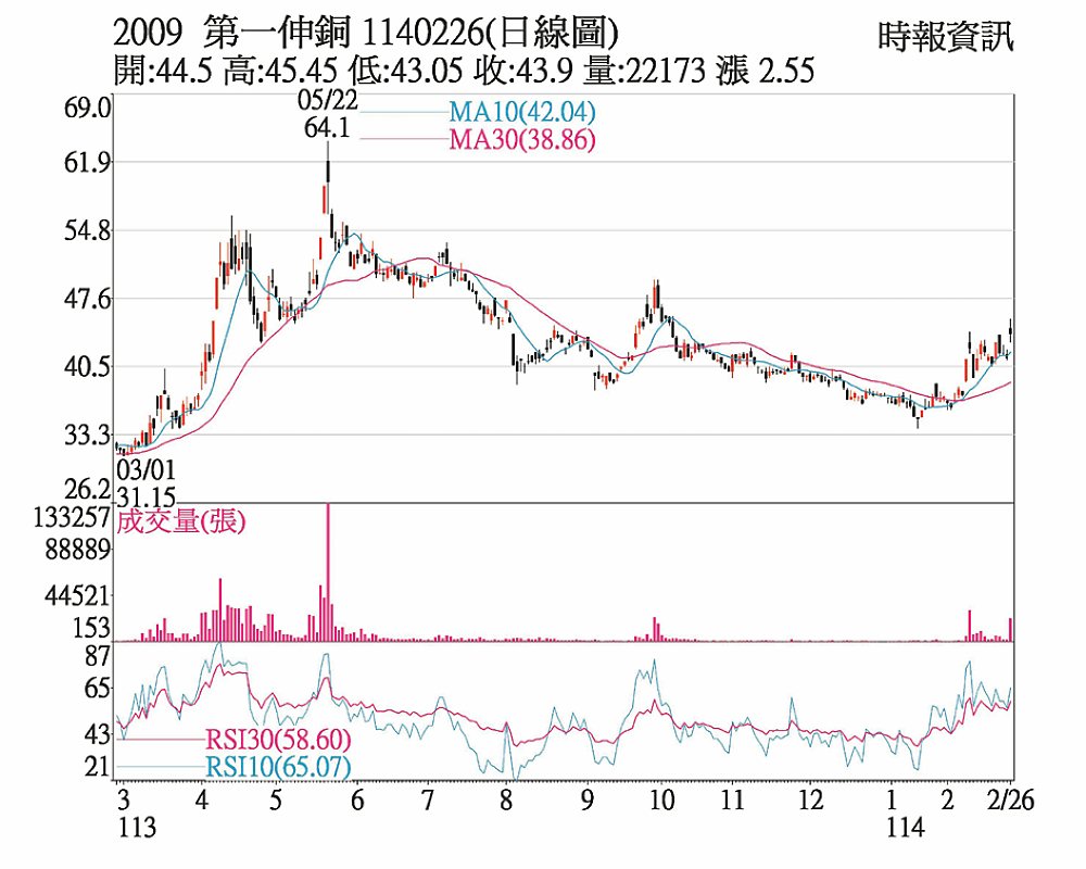 第一銅(2009)受惠美國總統川普宣布將對進口銅產品展開調查,可能會對進口銅課徵關稅等消息激勵,帶動26日股價開盤爆量急拉漲停板45.45元,改寫近三個月新高,然調節賣壓旋即出籠,漲幅收斂,終場收43.90元、漲幅6.17%。近期國際銅價回溫,加上川普貿易戰推波助瀾,股價可望繼續上攀。