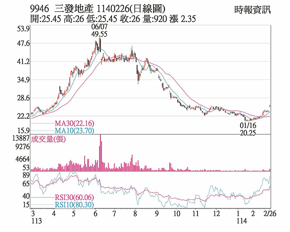 三發地產(9946)受惠全心投控(2718)將以每股25元代價收購2成股權的題材,26日開盤5分鐘即強鎖漲停至終場,終場收漲停價26元,重返近91個交易日新高,日KD高檔黃金交叉;成交量放大到913張,其中三大法人買超120張。