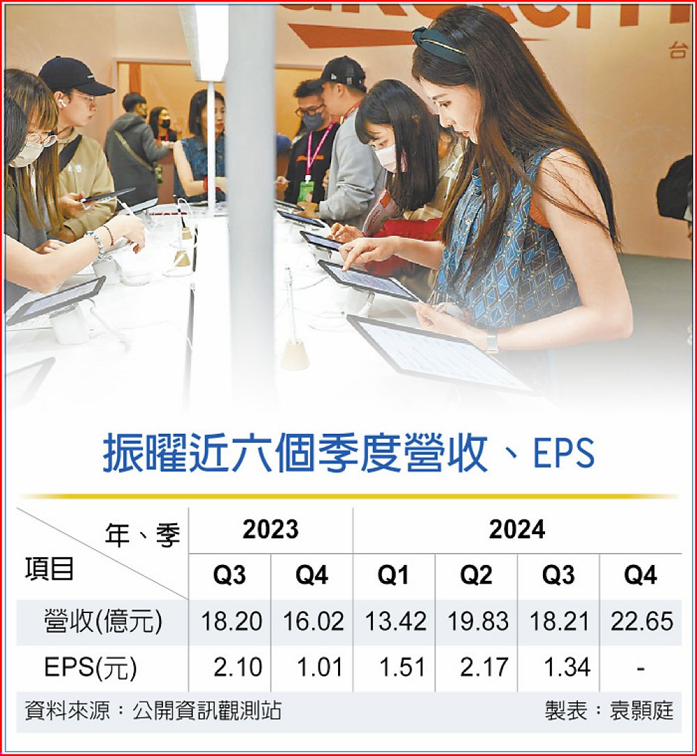 振曜(6143)舉行法說會,去年彩色電子書閱讀器熱賣,整體電子書閱讀器出貨量成長將近6成,帶動營收、獲利創新高。財務長黃子瑋表示,目前電子書閱讀器訂單能見度高,1月~8月預估仍有雙位數的年成長率。公司射出兩支綠經濟的箭,彩色電子書站穩第一步,彩色電子廣告看板將是下一個潛力產品。