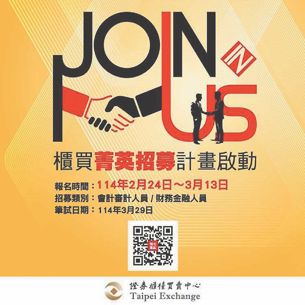 台灣唯二的證券交易所-證券櫃檯買賣中心114年度徵才開跑,竭誠歡迎會計及財金二大專業領域人才加入櫃買團隊,共同創造資本市場的多元未來。
