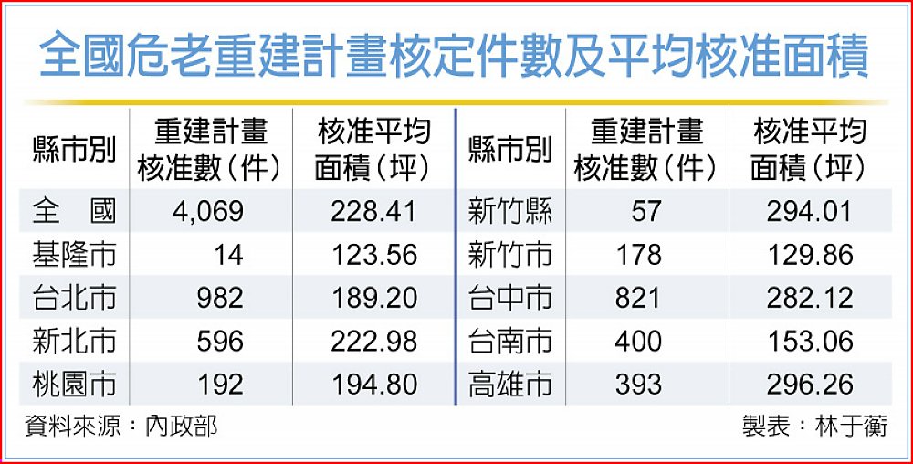 危老上路近八年,截至2024年底,全國各縣市受理危老重建案合計4,359件,已核准實施重建計畫者4,096件,其中以台北市982件最多,台中市821件、新北市696件。近年地震頻傳,民眾更新意識提升,隨危老時程獎勵即將歸零,地方政府近期將展開最後階段宣傳,在獎勵截止前還有機會再現掛件潮。