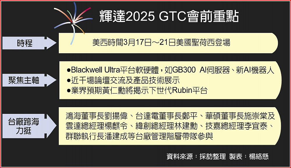 GTC大會將有來自全球數千名開發人員、企業領袖齊聚一堂,黃仁勳將發表主題演講,現場也會有近千場論壇交流以及產品技術展示,業界預料,大會主軸將持續聚焦在Blackwell Ultra平台軟硬體,包括GB300的AI伺服器、AI代理及新型AI機器人,並進一步成為今年供應鏈的營運動能。