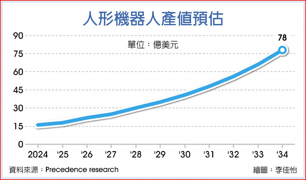 根據研調機構TrendForce研究指出,在2025年各機器人大廠逐步實現量產的前提下,預估2027年全球人型機器人市場產值有望超越20億美元,2024年至2027年間市場規模年複合成長率將達154%。