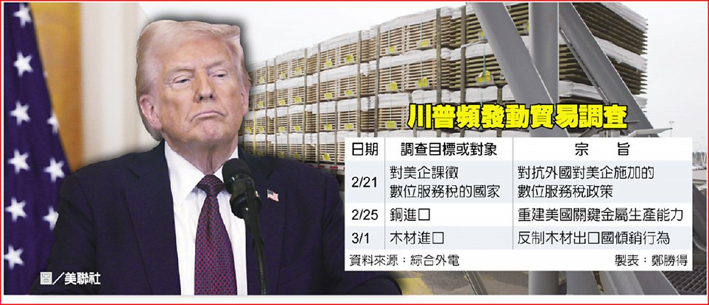 美國總統川普1日下令展開新的貿易調查,可能對進口木材加徵更多關稅,此舉恐導致貿易衝突升溫。這是川普在十天內發動的第三次新關稅調查,前兩項分別針對進口銅與對美企課徵數位服務稅的國家。