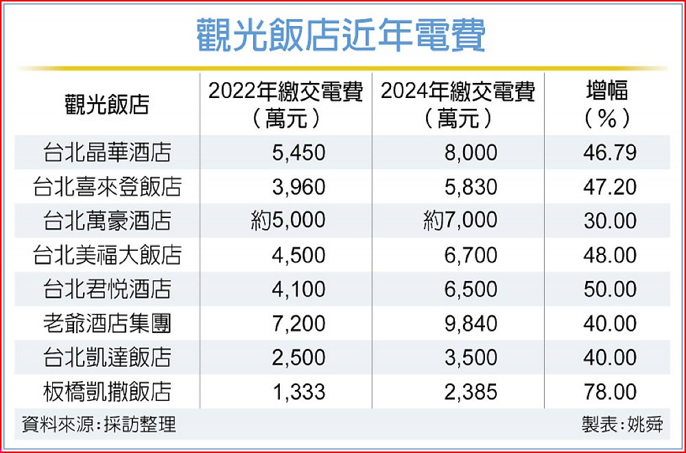過去三年因電價持續上調加上產業復甦用電量激增,觀光飯店電費大幅增加。以金額計算,去年飯店業電費負擔平均較疫情期間的2022年大增40%至50%,客房數超過800間、全台量體最大的台北君悅酒店增加逾5成,板橋凱撒飯店電費成本從占營收2.5%上升至3.7%,所交電費從增加78%。