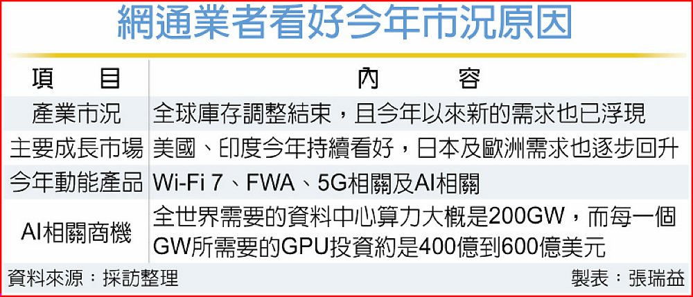受歐美市場庫存壓力影響,台系網通廠去年營運表現多數呈現放緩,整體低於前一年水準,但隨下游庫存已回健康水位,Wi-Fi 7產品放量、AI商機帶動,再加上美國及印度基礎建設需求等四大利多助攻,預期智邦(2345)、中磊(5388)、智易(3596)、啓碁(6285)及神準(3558)等廠商今年營運可望受惠。