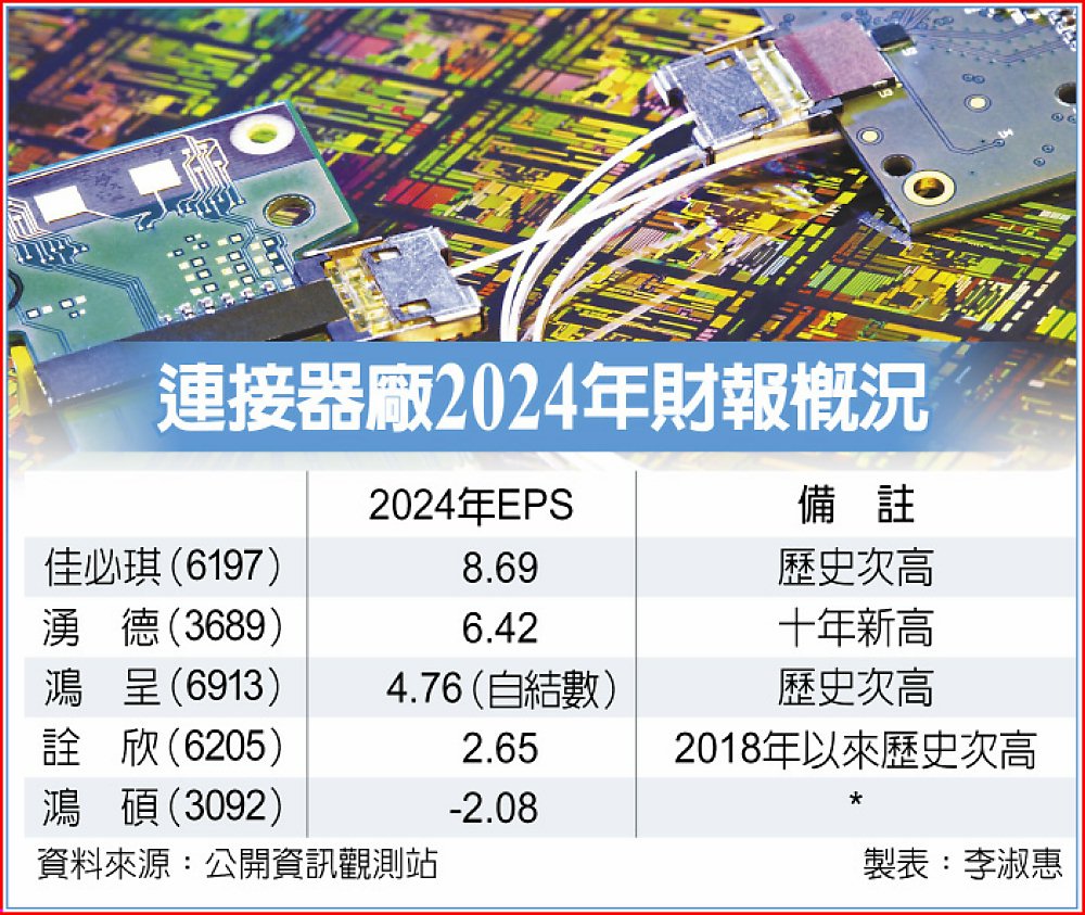 在景氣逐漸走出疫情陰霾、新應用帶動線材升級、增量之下,連接器廠2024年財報嶄露頭角,已公布財報的佳必琪(6197)、湧德(3689)去年EPS連袂突破半個股本,分別以8.69元、6.42元登歷史次高、十年新高紀錄,多家高價連接器廠將於3月上旬至中旬揭露財報,可望將連接器廠財報周推向高潮。