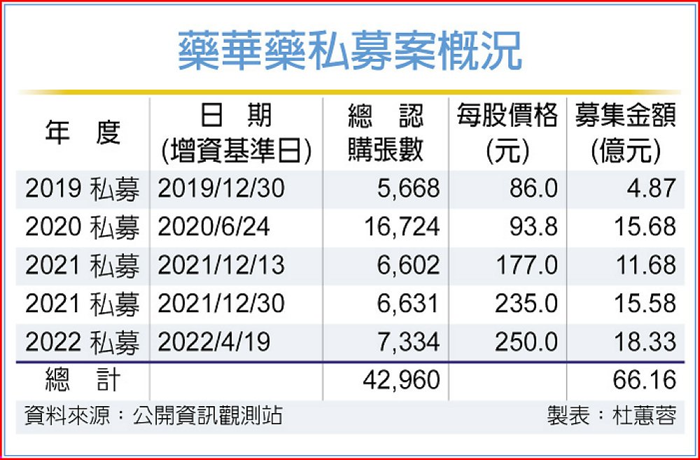 據統計,藥華藥五次私募案合計認購42,960張,募資金額約66.16億元。五次私募每股認購金額分別為86、93.8、177、235和250元。