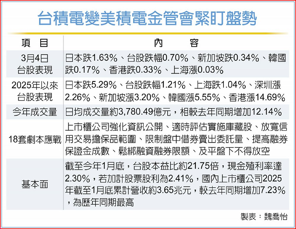 台積電擬加大投資美國的消息,4日衝擊台股、盤中一度重跌400點,但台積電股價仍力守住千元關卡。面對動盪的全球局勢,金管會強調,台股今年以來,成交量、信用擔保維持率等指標都維持在正常水位,基本面也相當穩健,金管會將密切關注國際金融市場變化,適時祭出相應措施。