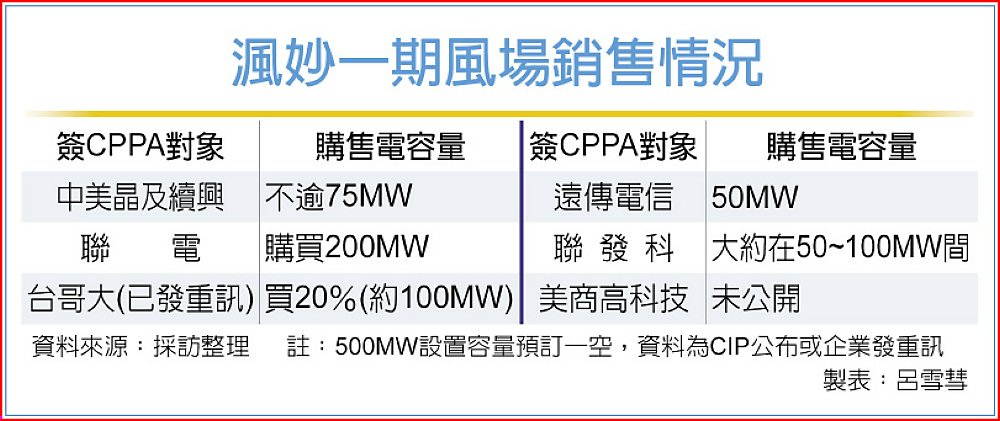 據悉,渢妙一期500MW設置容量已「完售」,總計被六家國內外企業瓜分,含半導體、電信、高科技業等,已浮上檯面已有五家,除CIP正式對外公布的中美矽晶及續興公司、聯電、遠傳電信、聯發科之外,還有一家台灣大哥大自行發布過重訊,這些企業都展現邁向減碳淨零的決心。其中以聯電購買最大宗約200MW,聯發科則約50~100MW。