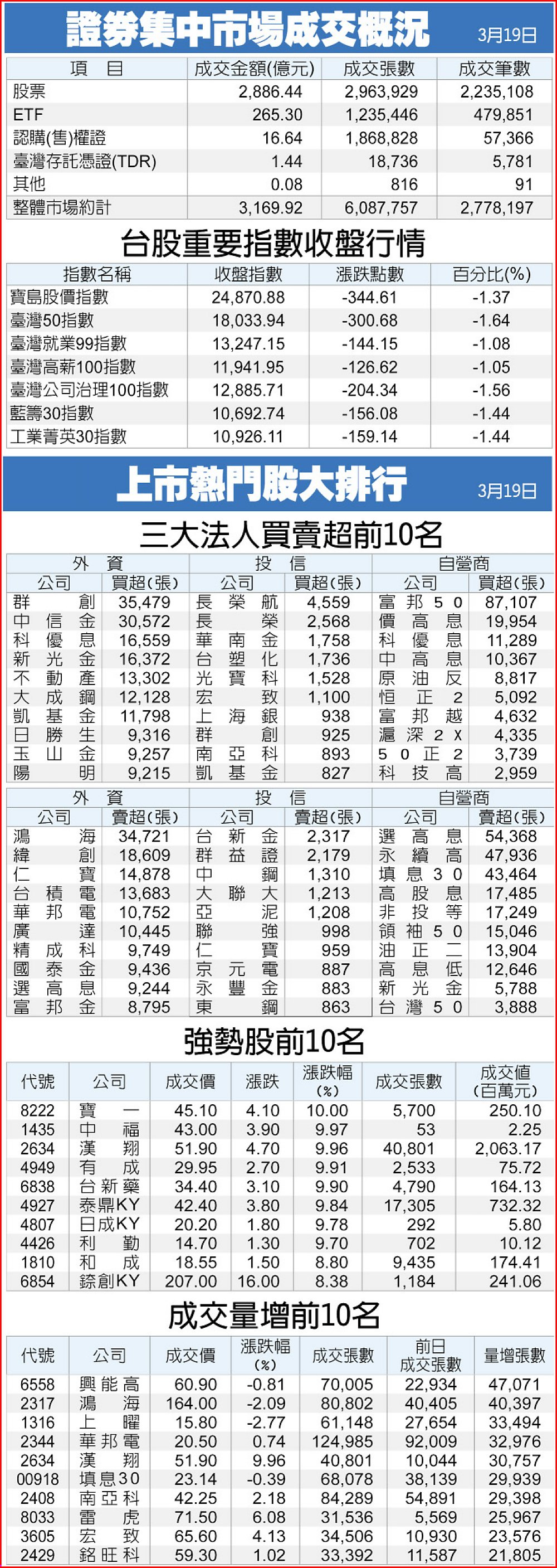 證券集中市場成交概況、上市熱門股大排行