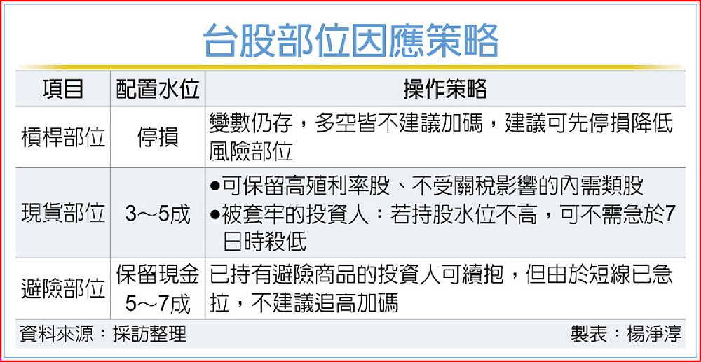 持股水位建議可降到3至5成以下,現金部位拉高到5到7成,股票保留的部位可先以高殖利率股、內需型、穩定收益型為主,高殖利率股由於去年獲利還不錯,有望具高殖利率,不過標的方面仍需觀察公司所屬產業的景氣變化性以及關稅對其的影響性;而內需型產業則包括電信、百貨通路、食品等。持有現貨部位但被套牢的投資人,法人建議可以視持股水位與風險承受度調整,若持股水位不超過3成的投資人,不一定得在7日殺低。