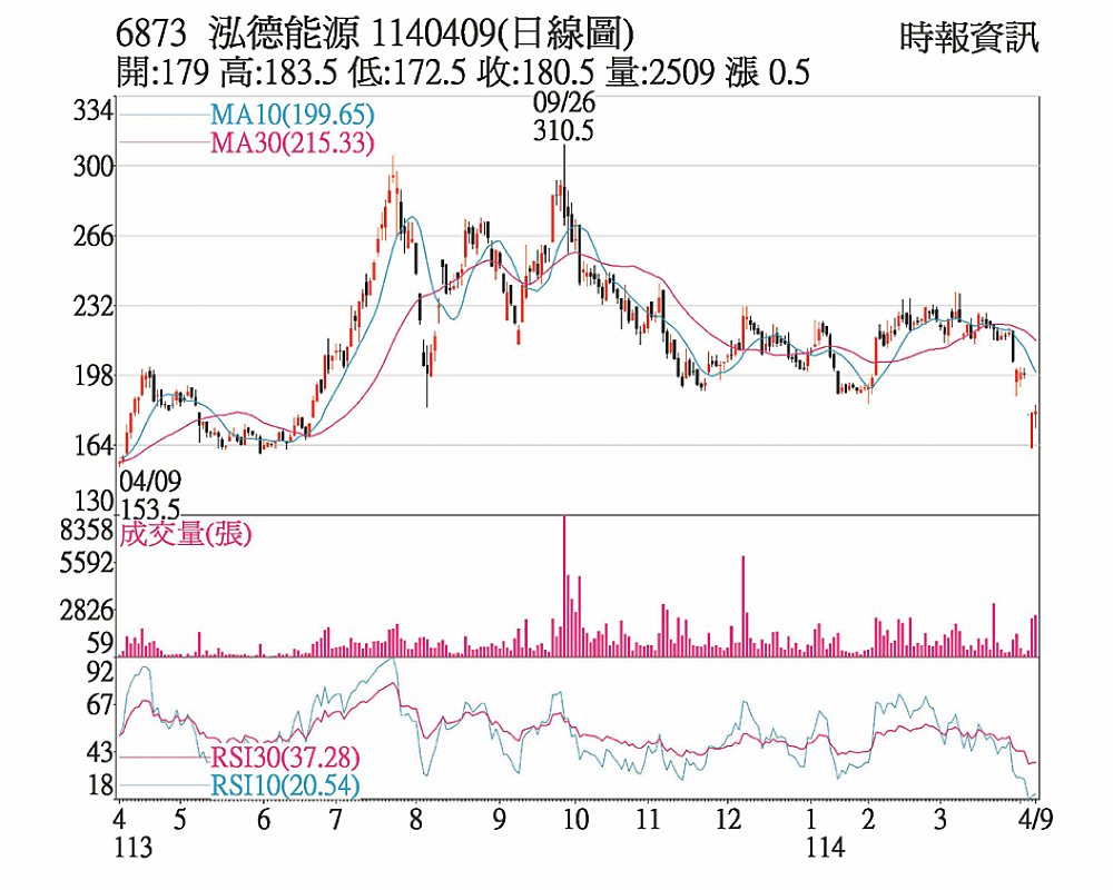 美國對等關稅上路,不過非出口產業的新能源公司不受關稅影響,泓德能源(6873)股價率先反彈。泓德能源9日股價在平盤附近震盪,終場上漲0.28%作收,收盤價180.5元,成交量約2,486張。