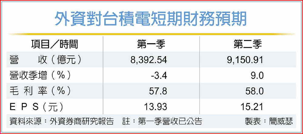 瑞銀證券則估計,台積電應能彌補地震造成的晶圓損失,將第二季營收季增預估由5%上調至9%。同時,反映產能利用率提升、先進製程漲價效益、產品組合改善之利多,預期毛利率將由第一季的58.5%小幅提升至第二季的58.8%。