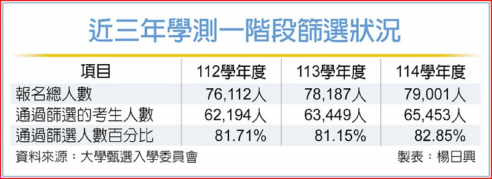 大學學測第一階段篩選結果日期公布,今年有79,001人報名、有65,453人通過,通過率達到82.85%、按年大增1.7個百分點,人數與通過率雙雙創下近三年新高,通過率也是歷年次高。