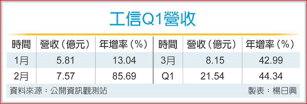 工信(5521)首季營收21.54億元、年增逾4成,創近15年同期新高,激勵14日股價強彈9%領漲營建類股。工信首季也有新案進入施作階段,年內受益高毛利新案與舊案轉換,有望增收也增利,提振今年毛利向上。