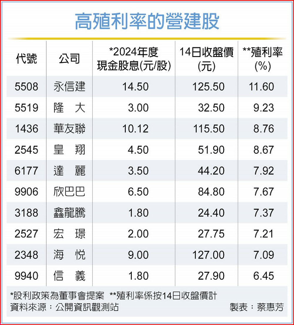 據統計,至少有16檔上市櫃建商殖利率達5%以上,其中永信建殖利率高達11.6%最強,9%以上的有隆大9.23%,8%以上有華友聯、皇翔,7%以上的有達麗、欣巴巴、宏璟、海悅。