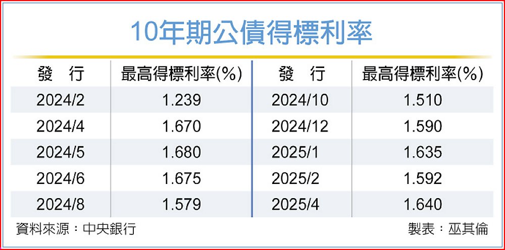 中央銀行15日代財政部標售增額發行10年期公債,雖然額度維持300億元正常水準,由於今年金融債暴增、公司債發行明顯回溫,壓縮公債熱度,本期最高得標利率因此升至1.64%,較2月同天期上揚4.8個基本點(1個基本點為0.01個百分點)。銀行資金調度主管指出,本期得標利率雖符合市場預期的1.58%~1.65%大區間,但落在1.62%~1.64%中間值上緣,顯示市場對美國關稅不確定增加,金融業投標較謹慎,偏向握著更多現金待命。