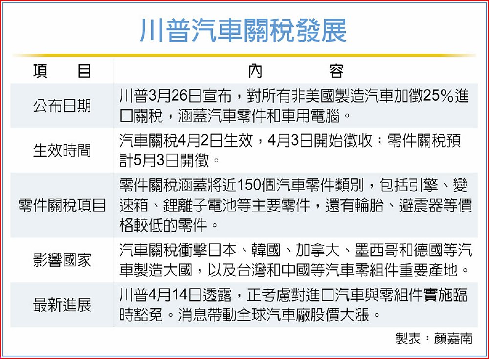 美國繼上周末給予手機等科技產品關稅暫時豁免後,美國總統川普14日暗示,他考慮暫時豁免25%汽車關稅,給予汽車廠時間調整供應鏈,回美國本土製造。消息帶動全球汽車廠股價躥揚。