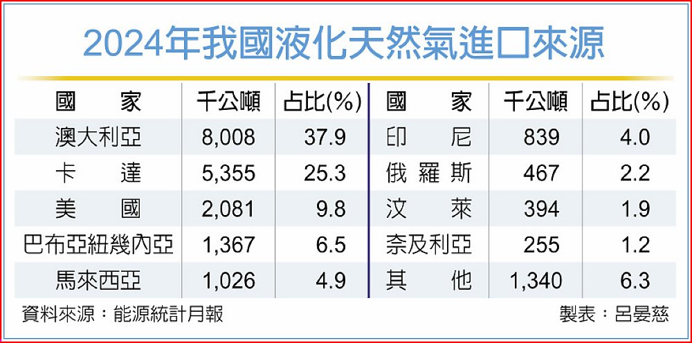 依據經部能源統計月報,2024年我國自美國進口的液化天然氣占比達9.8%,郭智輝先前指出,若增加採購阿拉斯加LNG,自美國進口的液化天然氣占比可能擴增至3成。不過,先前中油與美方所簽的只是投資意向書而非採購合約,除了台灣之外,包括日本、韓國、菲律賓等國都有意購買。