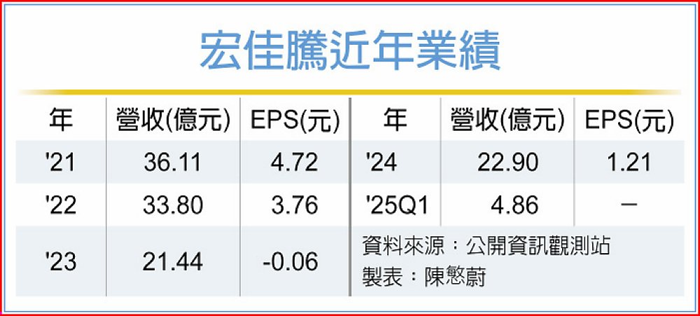 宏佳騰去年營收22.9億元,年增6.81%,稅後純益0.88億元,較2023年轉虧為盈,每股稅後純益(EPS)1.21元。今年第一季營收4.86億元,年增8.4%。