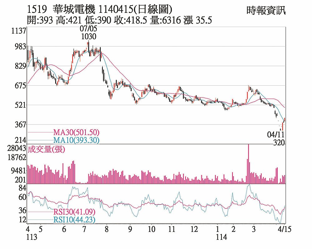 華城(1519)輝達攜手台灣供應鏈夥伴,在美國製造AI超級電腦工廠,市場預期電力需求大增,開盤大漲10元以393元開出,三大法人買超328張,推升盤中亮燈漲停421元,獲利回吐賣壓湧現而拉回,終場漲35.5元,收盤價418.5元,站穩5日及10日均線。