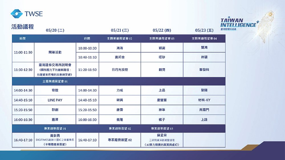 首先於5月20日出席主題業績發表會的公司有奇鋐.LINE PAY、群創、嘉澤等,5月21日鴻海、富邦金、日月光投控、力成、耕興、康霈*、義隆等,5月22日有穎崴、旺矽、創見、上品、慶豐富、神準、橘子等,5月23日有雙鴻、祥碩、聯發科、聚陽、材料-KY、所羅門及上詮等。