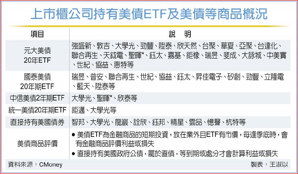 目前元大美債20年ETF是上市櫃公司最偏好的美債ETF,計有強盛新、敦吉、大學光、勁豐、陞泰、欣天然、台聚等公司在去年第四季底持有。至於直接購買美國債券的也不少公司,包括有智邦、大學光、龍巖、詮欣、鈺邦、精星、雲品、憶聲、杭特等。