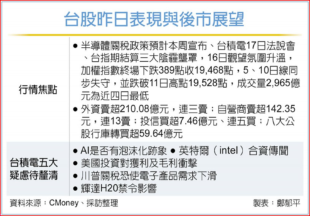 美國關稅政策搖擺不定,美國首波談判優先對象台灣未能入列,加上輝達因H20提列55億美元損失,在台積電領跌與台指期遭外資壓低結算,台股16日開低走低、反彈行情受阻,終場下跌389點收19,468點,跌破5日與10日線,成交量縮減至2,965億元為近四日最低。