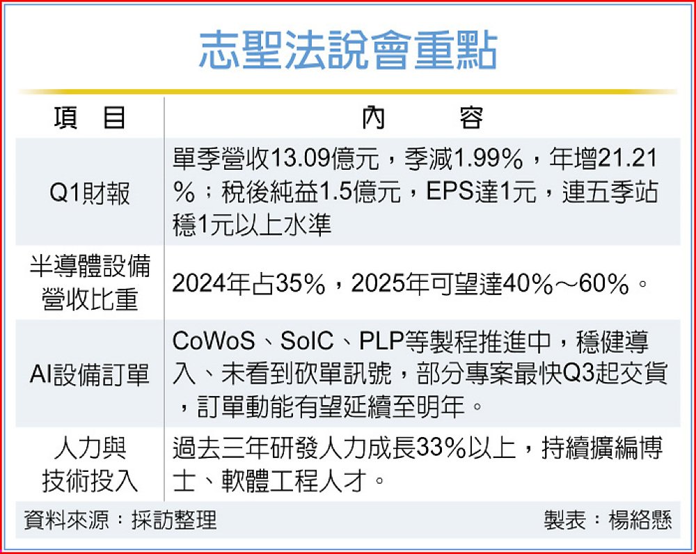 展望後市,為強化AI高階封裝設備能力,志聖今年持續擴編研發人才,近三年人力已成長33%以上。另針對美國關稅戰則評估影響不大,直接輸美設備占比不到0.5%,因此今年營運動能仍聚焦在半導體先進封裝,全年營收可望向上成長,惟需留意關稅引發終端需求下滑影響。