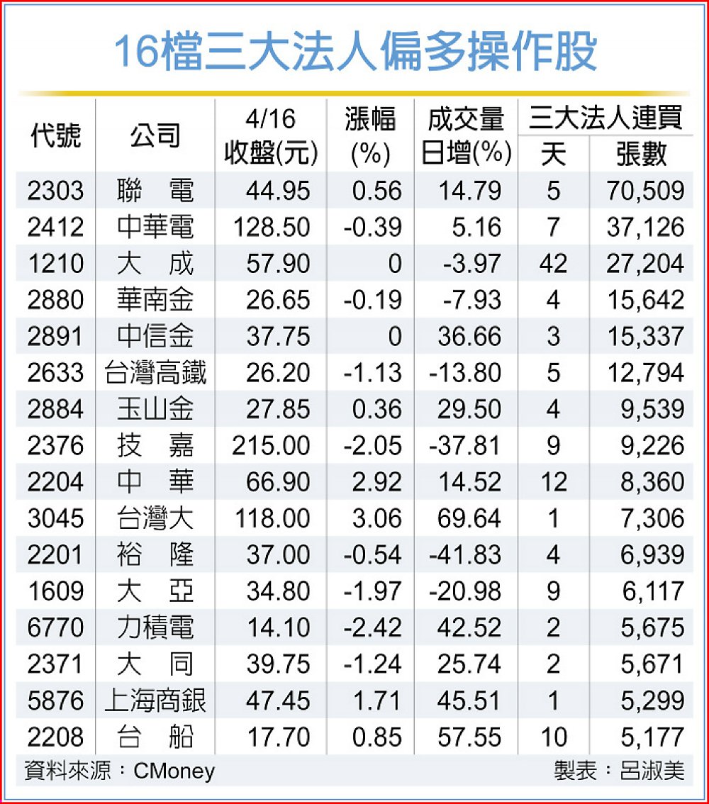 外資及證券自營商賣不休,致三大法人累計連3日賣超達664億元,惟法人資金轉進具有防禦性質的高殖利率或較不受關稅戰的內需股,包括聯電(2303)、中華電(2412)、大成(1210)及華南金(2880)等16檔個股,獲得三大法人偏多操作。
