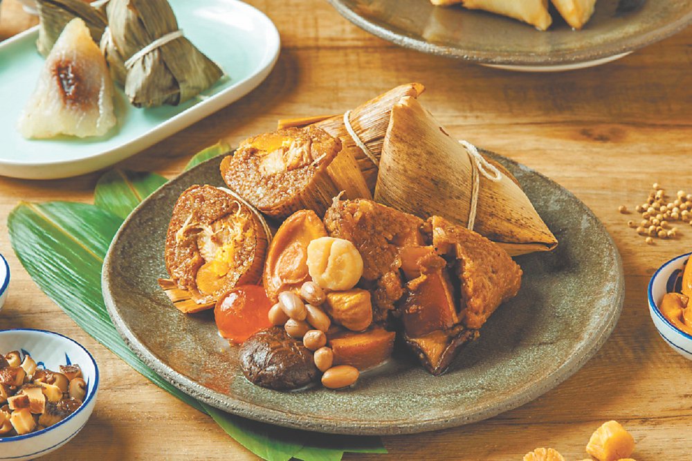 本次主打的「鮑魚干貝八寶粽」以澎湃海味融合傳統北部粽工藝,嚴選台灣糯米與肥瘦比例完美的五花肉為基底,佐以鮑魚、干貝、香菇、菜脯等豐富配料,搭配主廚特製白胡椒粉與紅蔥頭酥提香,並以桂竹葉包裹蒸炊,層層堆疊出北粽經典鹹香風味。另一款「鮑魚櫻花蝦客家粿粽」則傳承客家粽繁複製程,融合黑豬絞肉、鮮干貝、東港櫻花蝦、竹筍與沙茶炒菜脯絲等食材,展現粿粽獨有的細緻與香氣。