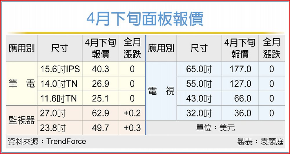 TrendForce公布最新4月下旬面板報價,電視面板和筆電面板價格全面持平,而監視器面板則是維持小漲走勢。由於品牌廠庫存到一定水位,再加上關稅不確定性影響,多數品牌廠4月開始下修訂單,因此第二季電視面板出貨季增率下修到2%,而IT面板拉貨相對平穩。