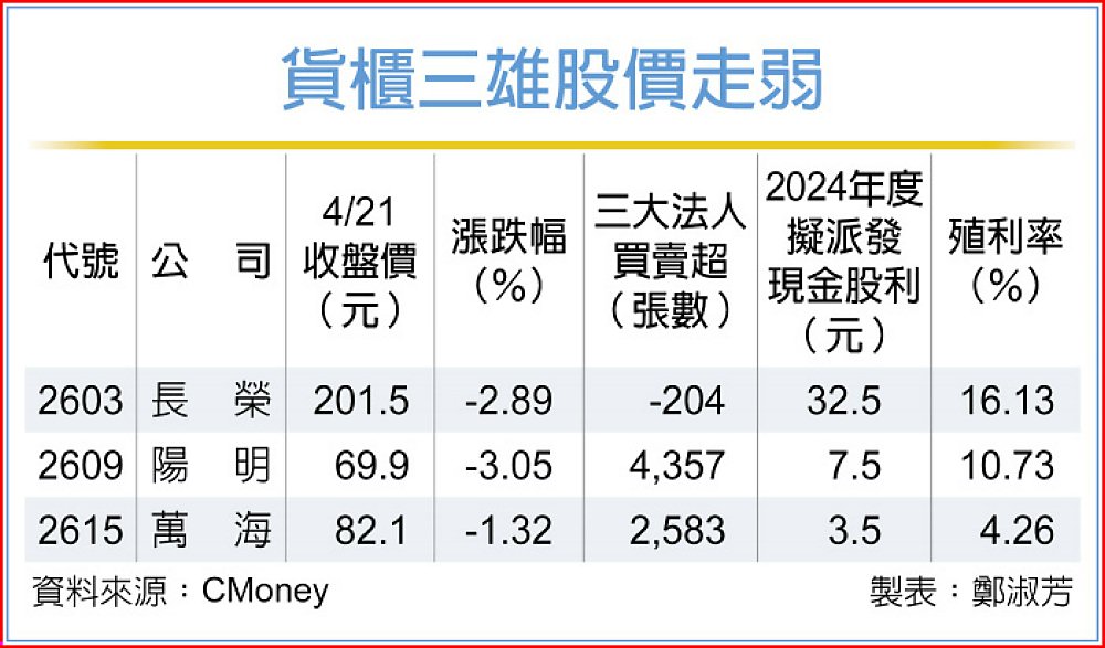 雖然伴隨著股價走低,現金股息殖利率也同步走揚,但隨著今年獲利看衰、明年恐陷虧損困境的傳言四起,連帶也讓貨櫃三雄之前引以為傲的高現金殖利率保護傘失效,不過此說法並沒有嚇跑三大法人,貨櫃三雄中除長榮出現204張賣超外,陽明和萬海仍續呈買超,其中萬海是連二買,陽明則由連二賣轉買。