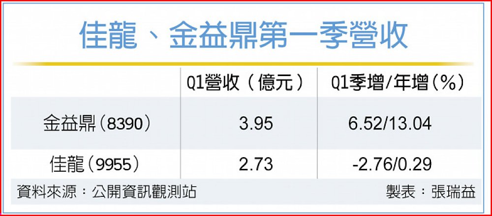 由於去年以來,國際金價就持續走揚,也使得佳龍去年以來營運受惠,今年第一季佳龍營收為2.73億元,相對去年同期小幅減少2.76%,較去年同期微幅增加0.29%,市場法人看好,國際金價近日創歷史新高之下,再加上後市短時間內,全球金融市場恐仍持續震盪,黃金價格仍緩步走升,市場看好佳龍Q2營運可望續攀升。