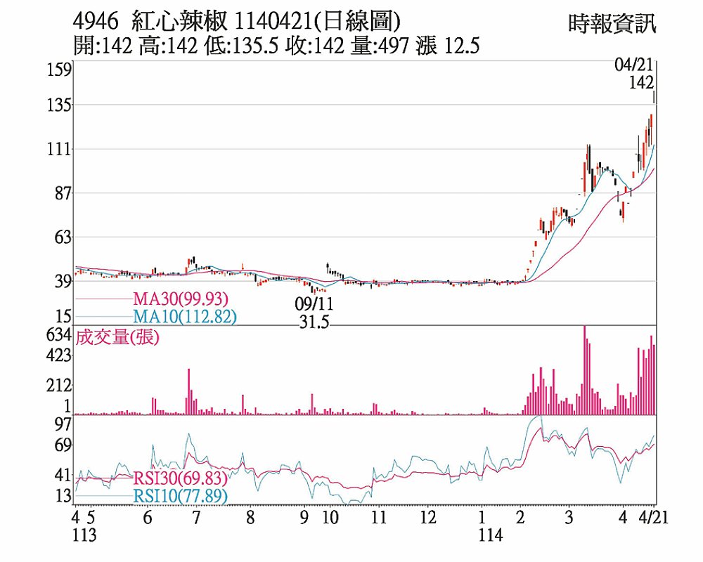 辣椒(4946)21日以漲停價142元跳空開出,開盤3分鐘雖打開,但隨即又拉漲停,直到收盤前才打開,當日最低價至135.5元,不過,尾盤仍強攻漲停,以142元作收,單日上漲12.5元,成交量465張,三大法人買超20張,目前股價站上所有均線之上,技術面偏多。