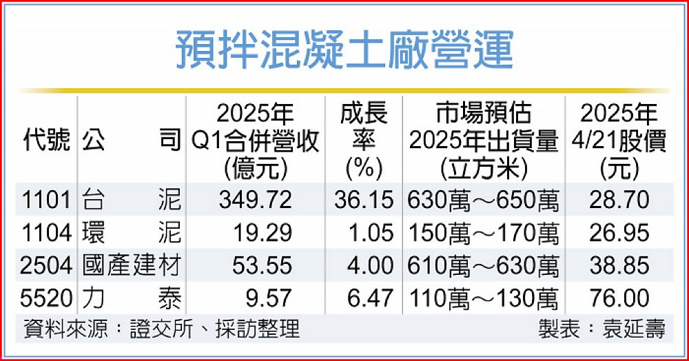 關稅之亂可能激發台商再次回流,加上科技廠辦對平均單價較高的高端產品需求增加,台泥(1101)、亞泥(1102)旗下亞東預拌、國產建材(2504)、環泥(1104)等預拌混凝土業者指出,產業屬內需市場,打房政策雖讓房產市場對預拌混凝土需求降緩,不過今年的市場在剛性需求下將呈「量小縮、價穩增」,整體營運仍會是營收持平、獲利小增格局。