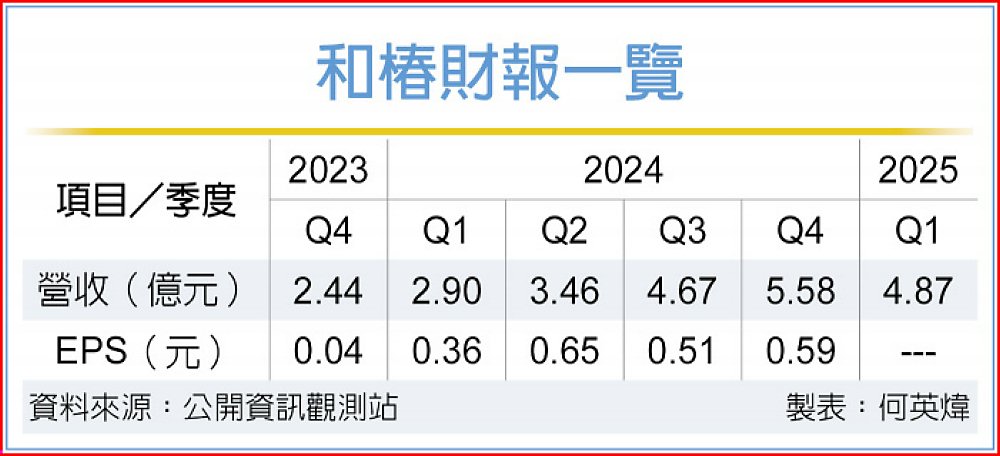 和椿去年將機器人業務視為第二成長曲線,到目前為止,成績頗為亮眼。2025年3月營收2.09億元,較去年同期大增85.81%,第一季營收4.87億元,年增67.97%。主要成長動能來自於機器人相關業務。