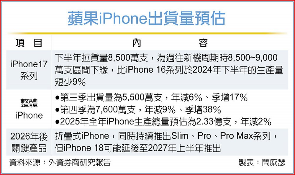 值得關注之處,在於摩根大通預估iPhone 17系列下半年拉貨量僅為8,500萬支,是過往新機周期時8,500~9,000萬支區間的下緣,同時,還比iPhone 16系列於2024年下半年的生產量短少9%。